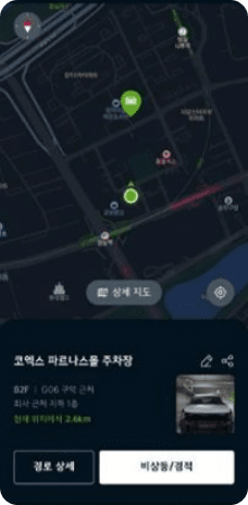 - 스마트폰 지도를 통한 주차 위치 확인 서비스는 차량과 스마트폰의 GPS 수신 환경에 따라 수십 ~ 수백m의 오차가 발생할 수 있습니다.